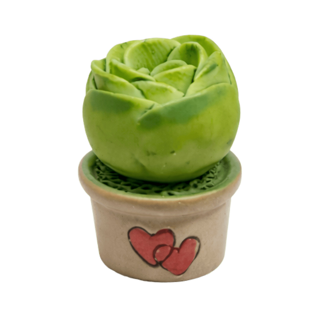 La petite plante succulente verte au design réaliste est placée dans un pot décoratif beige avec deux cœurs rouges, donnant un style chaleureux et original.