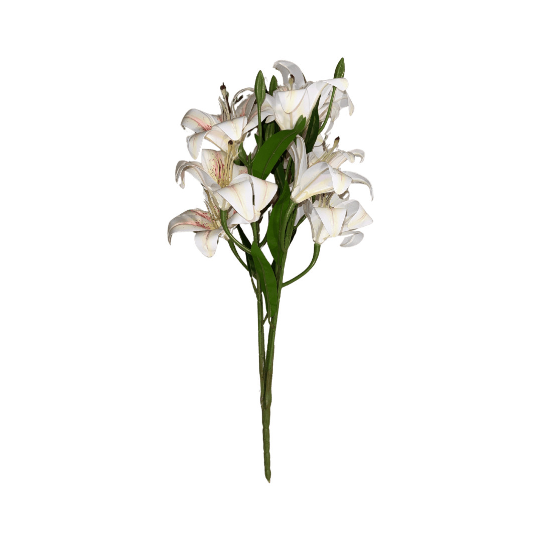 Bouquet de lys artificiels blancs délicatement teintés de rose et de jaune. Élégant et raffiné, idéal pour vos compositions florales et décorations de Toussaint.
