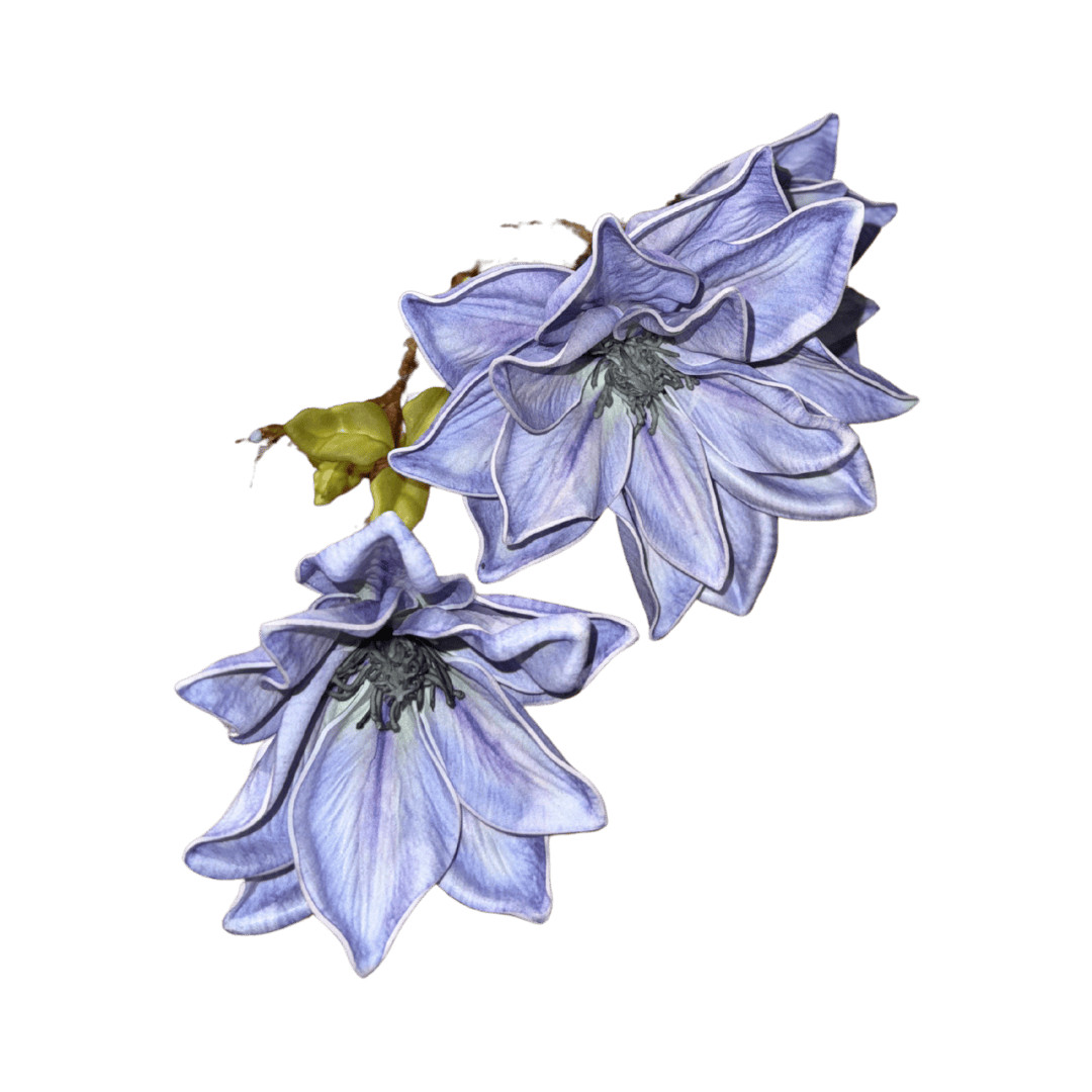 Clématite artificielle bleu lavande : 2 fleurs doubles volumineuses + boutons, pétales tissu premium, tige souple orientable. Idéale Toussaint, arches, bouquets et vitrines.