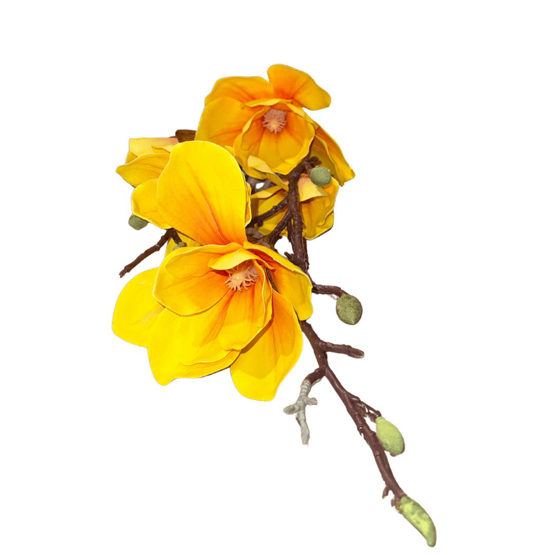 Magnolia artificiel jaune lumineux : 3 grandes fleurs + boutons, tiges brun “bois”, pistils réalistes. Parfait pour Toussaint, bouquets, arches et vitrines.