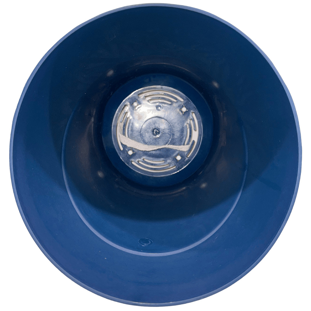 Pot bleu nuit avec sous plat blanc.