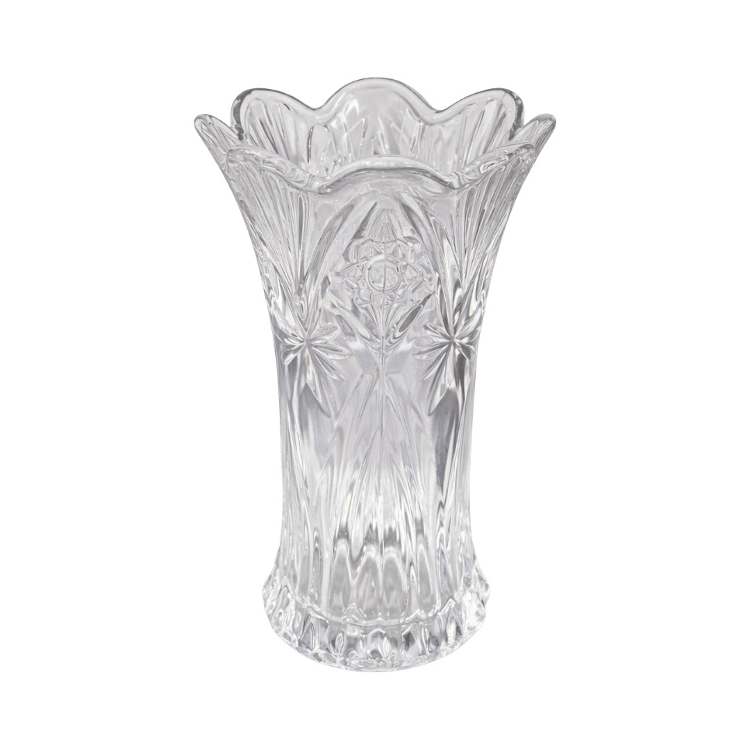 Fabriqué en verre transparent sculpté, ce vase présente des motifs décoratifs qui captent la lumière et mettent en valeur les fleurs disposées à l’intérieur. Sa forme haute avec bord ondulé lui donne un style à la fois classique et élégant.